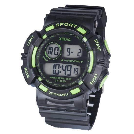 -Sport Electronic Wrist Watch: feacturing 12/24 hour format, alarm clock, calendar with date/week, 1/100 seconds of stopwatch stage timekeeping function, EL backlight. You can use it as a timer as well.