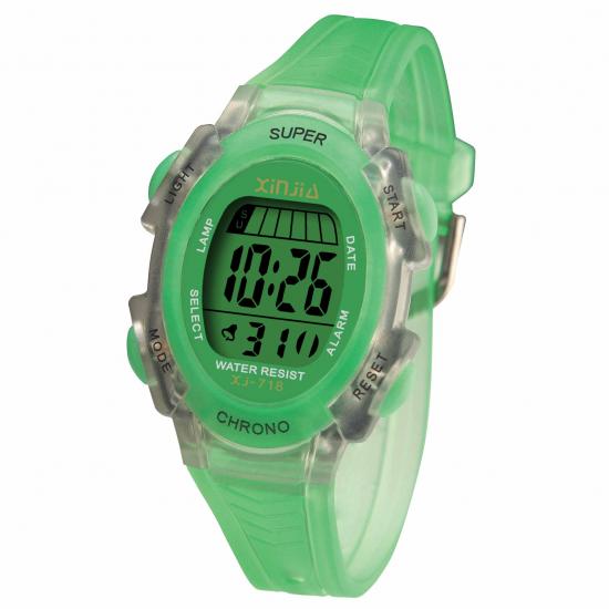 Egg-shaped dial design, green screen, elastic TPU strap, have amalgamated to form this digital watch.